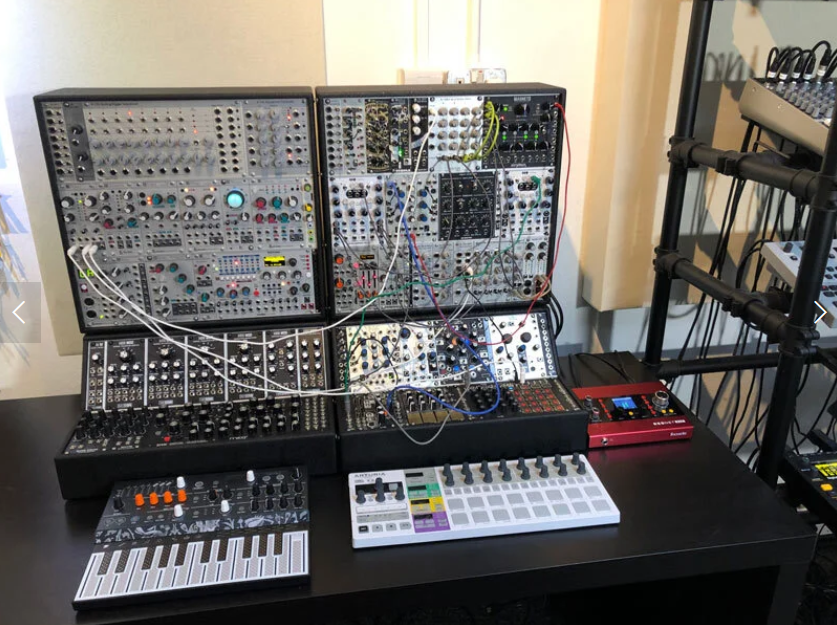 Dante在小型工作室的应用,图片中的红色设备为Focusrite Rednet X2P,它用作模拟合成器的监听控制器