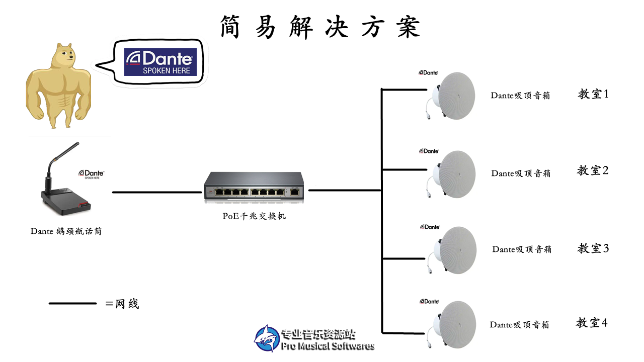 校长室使用支持Dante的鹅颈瓶话筒,连接到PoE千兆交换机上,4间教室使用4个Dante吸顶音箱,使用网线连接到交换机。然后用Dante Controller进行信号路由,将校长的话筒信号,通过交换机送入4间教室的Dante 吸顶音箱即可. 5根网线,送通4间教室的音频,任务就这样结束了~