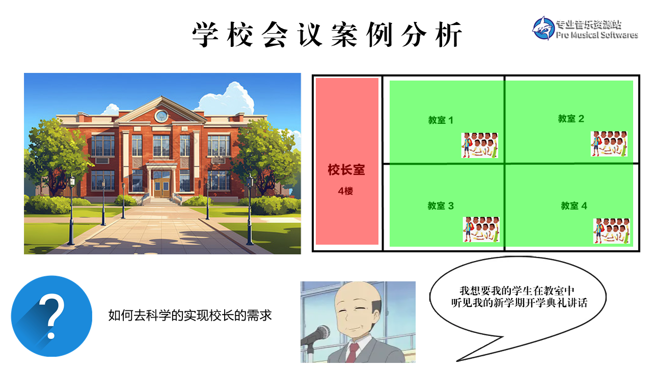这是一个学校的案例,校长想要在校长室中,向4个教室中的同学,发表新学期开学典礼的讲话。你应该如何去科学的实现校长的需求呢?