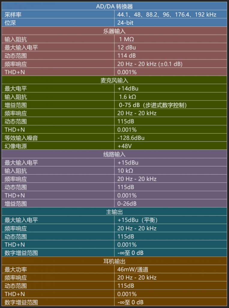 AD/DA转换性能:采样率和位深决定数字音频的精度上限。192 kHz/24-bit是目前主流专业声卡的标准配置,确保能捕捉和回放人耳可闻频段内的全部细节。115 dB的DAC动态范围意味着回放时,你能听到最微弱的声音细节和最响亮的声音之间的反差足够大,不会丢失音乐的动态表情。