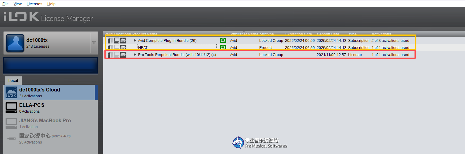 软件方面,对于订阅或者在有效支持计划中的用户,购买Pro Tools后,您会获得三个授权(如下图所示),它们分别为Pro Tools 软件授权(红色)、Avid Complete Plug-ins Bundle和HEAT(黄色)