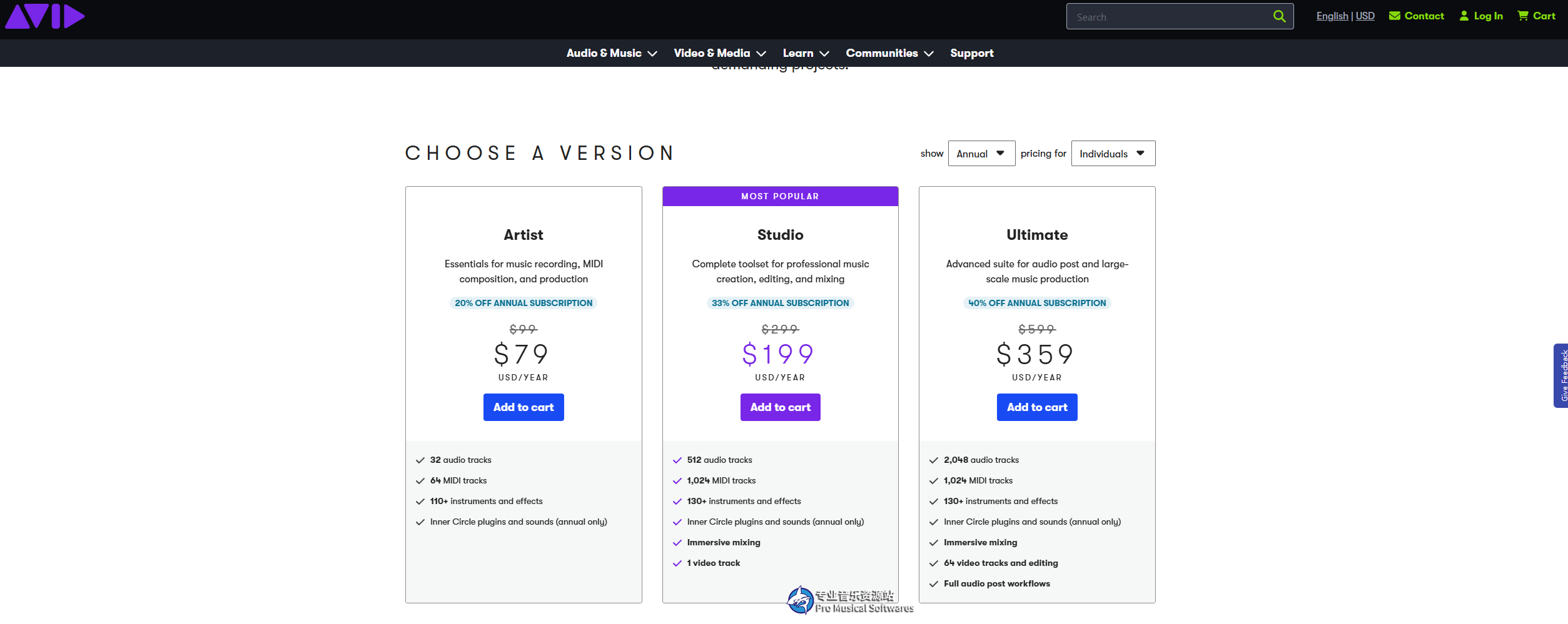 来自Avid Technology官网的截图(用户只能从这里购买到各版本的订阅版)
