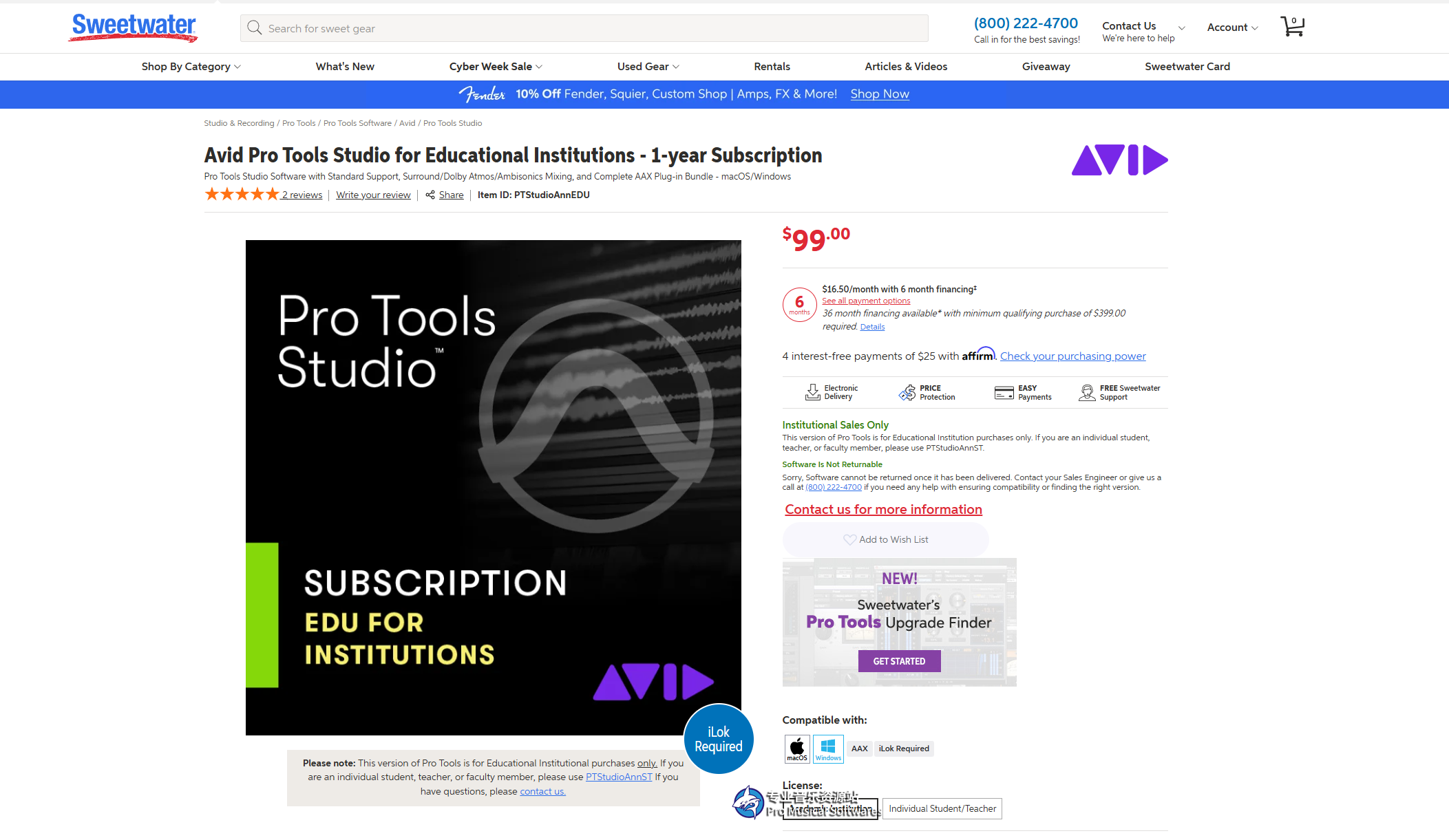 来自国外知名购物网站Sweetwater/甜水,Pro Tools软件为EDU和Institution提供优惠价格订阅